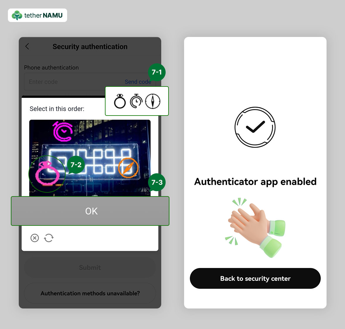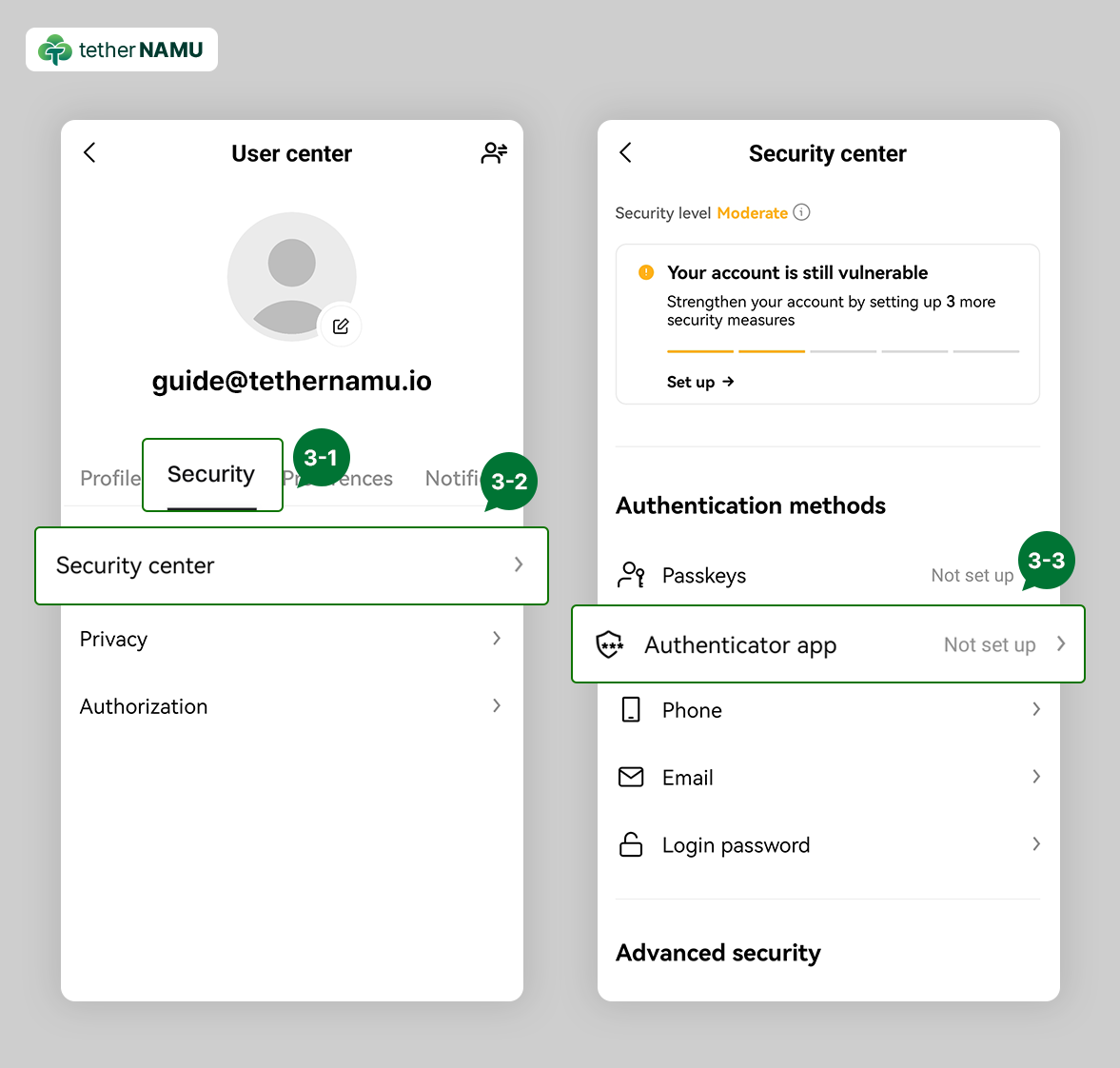 3. Security 탭에서 Security Center를 클릭 후, Authentication app을 클릭해 주세요.