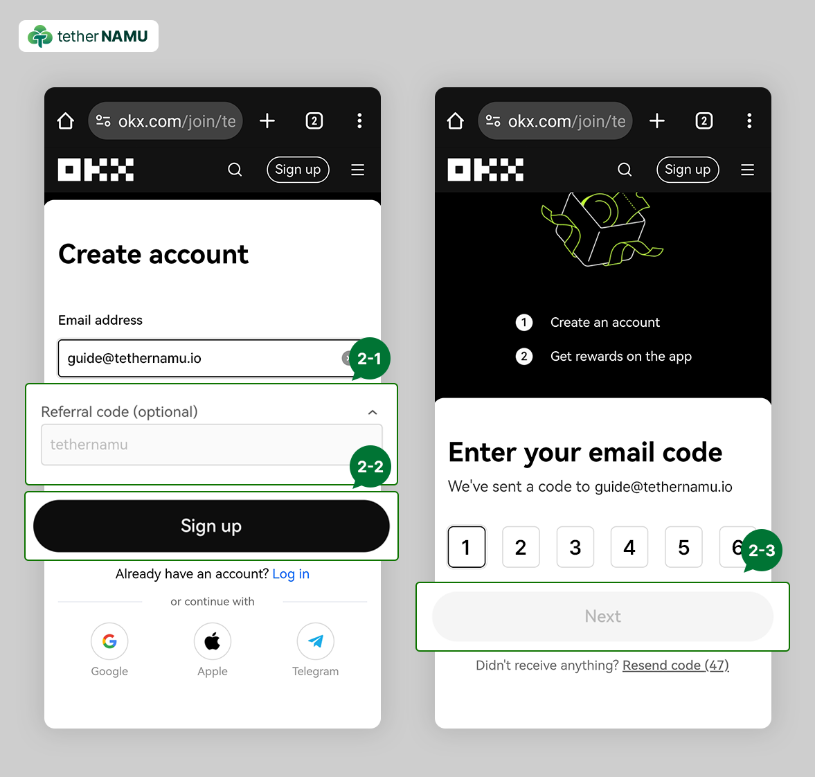 1. [OKX 셀퍼럴 계정 만들기] 클릭 또는 테더나무 홈페이지를 통해 OKX 가입 링크로 접속해 주세요.